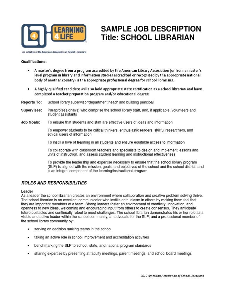 Librarian Job Description PDF School Library Librarian